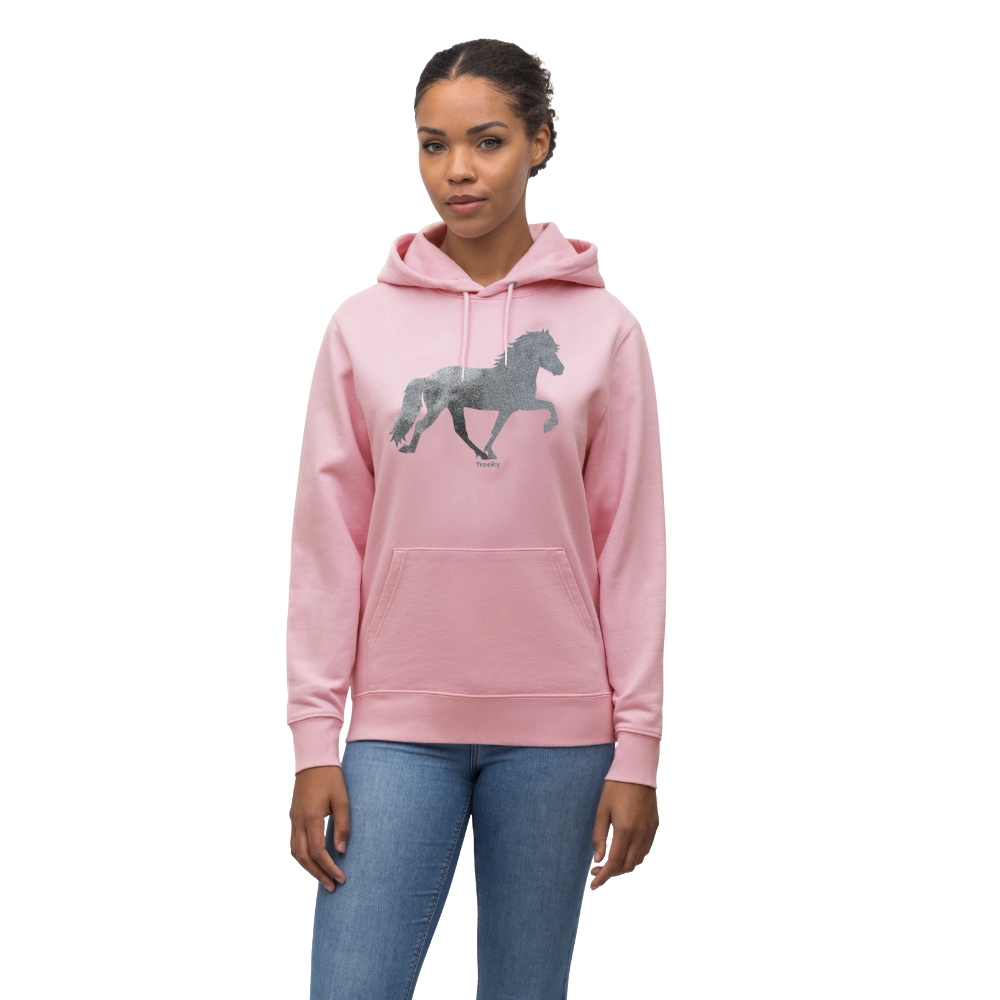 Der Troelty Hoodie Glit mit funkelndem Tölter-Motiv auf der Brust vereint Nachhaltigkeit, Komfort und dezente Eleganz – perfekt für alle, die ihre Liebe zu Islandpferden auch im Alltag zeigen möchten oder einfach Glitzer lieben.
